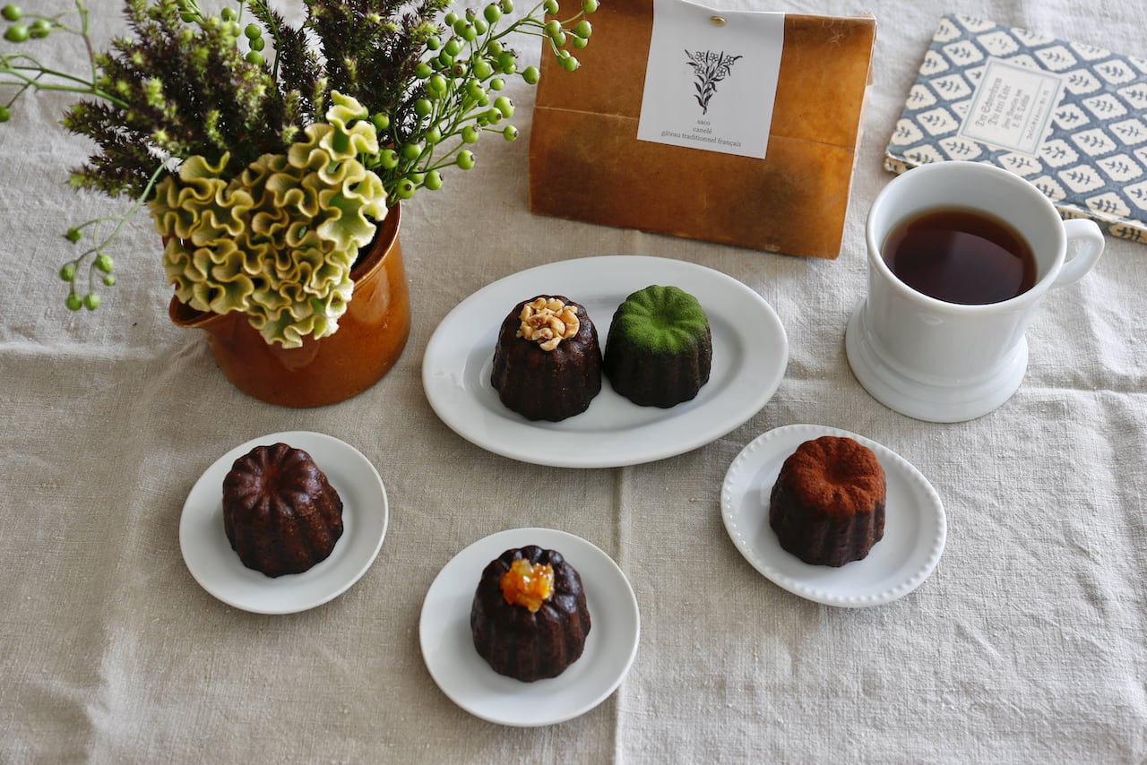 バニラカヌレ2個 / チョコレートカヌレ1個 / 抹茶カヌレ1個 / ヘーゼルナッツカヌレ1個 / オレンジチョコレートカヌレ1個